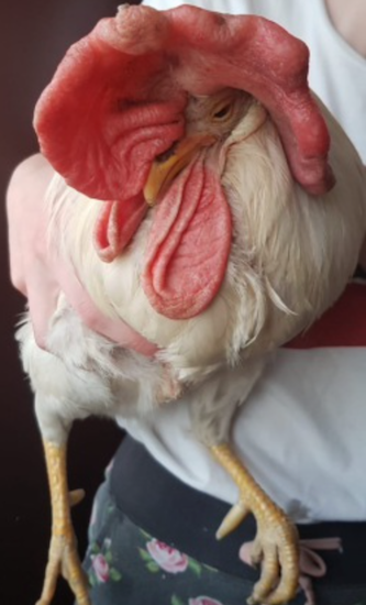 Attila fanden wir 2018 in einer Bodenhaltung als einen von drei überlebenden Hähnen. Abgemagert und kaum noch fähig zu stehen, wurde er von uns aus dem Stall getragen. Sein handtellergroßer, angeschwollener, heiß pulsierender Kamm verdeckte seine gesamte linke Kopfseite, war im Knick an der Unterseite und an anderen Stellen verletzt und schwer entzündet.