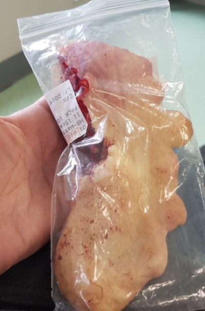 Der amputierte Kamm wog nach der OP 110g. In entzündetem, angeschwollenem Zustand nach der Rettung wird er sicherlich mindestens 150g gewogen haben. Attila selbst wog 1,5 kg, als wir ihn aus dem Betrieb holten. Somit wog die Last auf seinem Kopf mindestens 10% seines Körpergewichts...